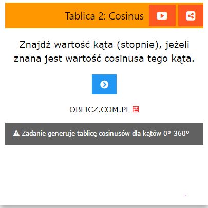 Znajdź wartość kąta (stopnie), jeżeli znana jest wartość cosinusa tego kąta.